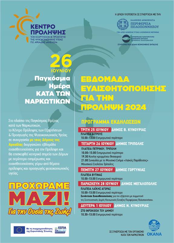 Η δράση εντάσσεται στην «Εβδομάδα Ευαισθητοποίησης για την Πρόληψη», που πραγματοποιείται,  με αφορμή την Παγκόσμια Ημέρα Κατά των Ναρκωτικών, σε συνδιοργάνωση του Κέντρου Πρόληψης των Εξαρτήσεων και Προαγωγής της Ψυχοκοινωνικής Υγείας Π.Ε. Αρκαδίας «ΑΝΕΛΙΞΗ» με την Περιφέρεια Πελοποννήσου – Γενική Διεύθυνση Δημόσιας Υγείας και Κοινωνικής Μέριμνας, το Περιφερειακό Παρατηρητήριο Κοινωνικής Ένταξης Περιφέρειας Πελοποννήσου – Συντονιστική Δομή Κοινωνικής Ένταξης.