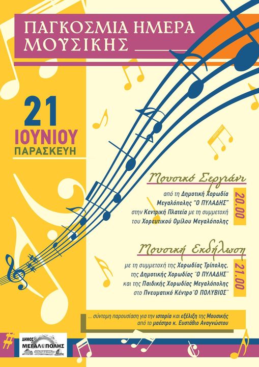 Ο δήμος Μεγαλόπολης τιμά την παγκόσμια ημέρα μουσικής στις 21 Ιουνίου 2024. Στις 20:00 η δημοτική χορωδία θα τραγουδήσει στη κεντρική πλατεία της Μεγαλόπολης ( ξεκινώντας από το ΚΟΧΙΜΠΑ και περπατώντας στους δυο πεζόδρομους θα καταλήξει μπροστά στο ηρώο όπου θα συμπράξει με τον χορευτικό όμιλο Μεγ/λης ). Με το τέλος αυτού του δρώμενου η χορωδία θα κατευθυνθεί πεζή στο πνευματικό κέντρο όπου στις 21:00 θα ξεκινήσει η εκδήλωση με τη συμμετοχή 3 χορωδιών. Η καλλιτεχνική δημιουργία της αφίσας είναι του μέλους της χορωδίας Αργύρη Τσιμπιρίμπη.ΝΑ ΕΙΣΤΕ ΟΛΟΙ ΕΚΕΙ!!!