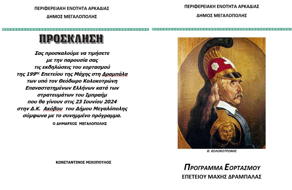 Σας προσκαλούμε να τιμήσετε με την παρουσία σας τις εκδηλώσεις του εορτασμού της 199ης Επετείου της Μάχης στη Δραμπάλα των υπό τον Θεόδωρο Κολοκοτρώνη Επαναστατημένων Ελλήνων κατά των στρατευμάτων του Ιμπραήμ που θα γίνουν στις 23 Ιουνίου 2024 στην Δ.Κ. Ακόβου του Δήμου Μεγαλόπολης σύμφωνα με το συνημμένο πρόγραμμα.