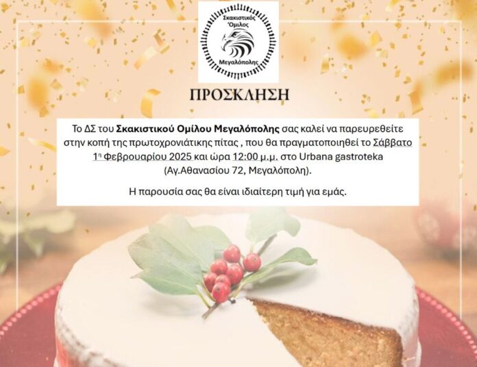 Το ΔΣ του Σκακιστικού Ομίλου Μεγαλόπολης σας καλεί να παρευρεθείτε στην κοπή της πρωτοχρονιάτικης πίτας , που θα πραγματοποιηθεί το Σάββατο 1η Φεβρουαρίου 2025 και ώρα 12:00 μ.μ. στο Urbana gastroteka (Αγ.Αθανασίου 72, Μεγαλόπολη).