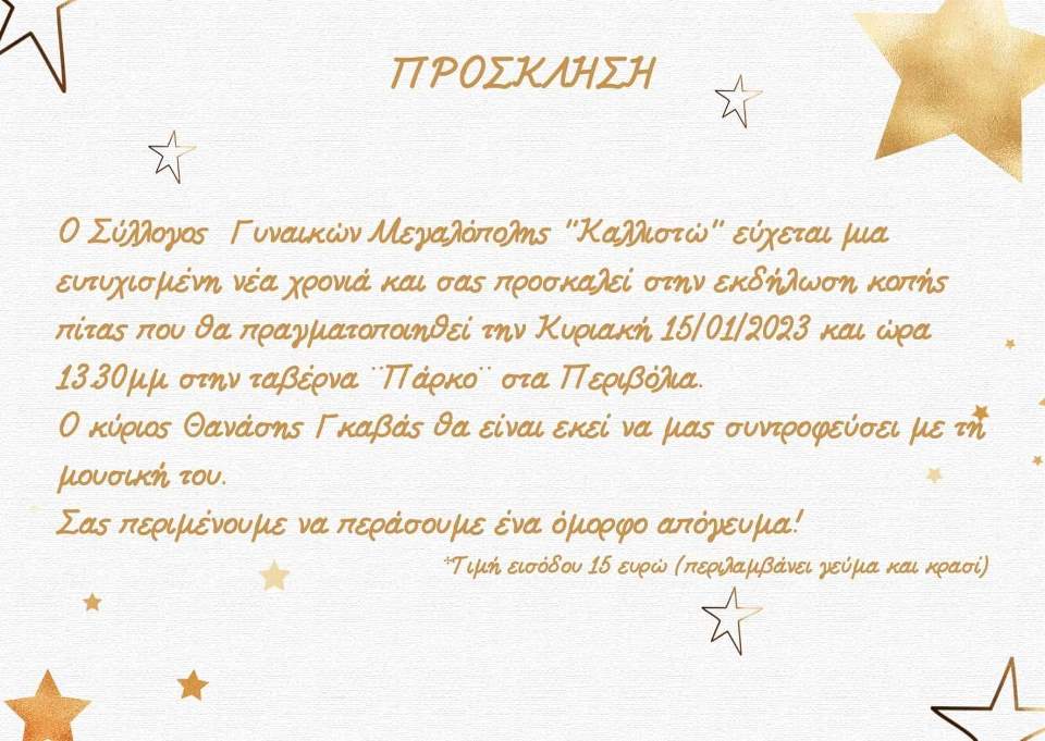 Ο Σύλλογος Γυναικών Μεγαλόπολης Καλλιστώ σας προσκαλεί στην εκδήλωση κοπής πίτας, την Κυριακή 15 Ιανουαρίου στις 13:30 , στην ταβέρνα “Πάρκο” στα Περιβόλια.