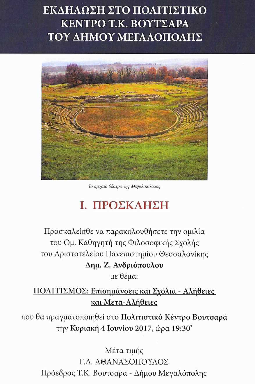 Την Κυριακή 4 Ιουνίου στις 19:00 στο πολιτιστικό κέντρο Βουτσαρά , θα πραγματοποιηθεί εκδήλωση με ομιλία του Ομ. Καθηγητή της Φιλοσοφικής σχολής του Αριστοτελείου Πανεπιστημίου Θεσσαλονίκης κ. Δημητρίου Ανδριόπουλου.