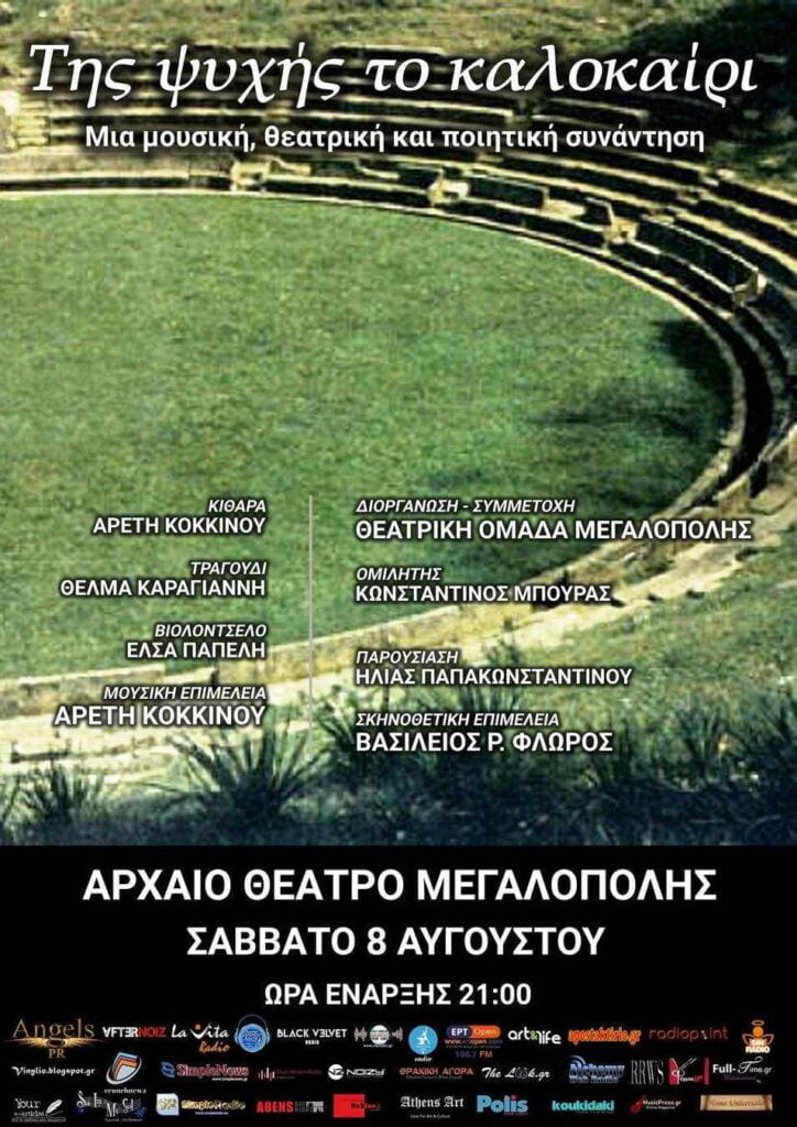 Αυτή η εκδήλωση με τίτλο “Tης ψυχής το καλοκαίρι” θα δένει αρμονικά με το επιβλητικό περιβάλλον του αρχαίου θεάτρου. Την εκδήλωση θ´ανοίξει ο θεατρολόγος κριτικός και λογοτέχνης Κων/νος Μπούρας, που θα μας μιλήσει για το θέατρο και την ποίηση. Θα διαβαστούν ποιήματα των Φλώρου, Παπακωνσταντίνου, Μπούρα, Παρασκευόπουλου και Παπαϊωάννου, από μέλη της Θ.Ο.Μ. Τέλος, το μουσικό κομμάτι της βραδιάς που επιμελείται η σκηνοθέτιδα και κιθαρίστρια Αρετή Κοκκίνου θα περιλαμβάνει τραγούδια δικά της αλλά και αγαπημένων συνθετών. Ερμηνεύει η Θέλμα Καραγιάννη, στο βιολοντσέλο η Έλσα Παπέλη.