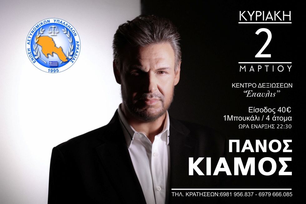 Η Ένωση Αστυνομικών Υπαλλήλων Αρκαδίας θα πραγματοποιήσει την Κυριακή 2 Μαρτίου 2025 και ώρα 22:30 την ετήσια χοροεσπερίδα της με τον Πάνο ΚΙΑΜΟ στο Κέντρο Δεξιώσεων Έπαυλις (3ο χλμ Τρίπολης – Άργους).