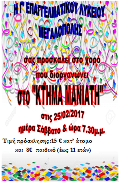Οι μαθητές της Γ’ΕΠΑΛ Μεγαλόπολης το Σάββατο 25 Φεβρουαρίου , διοργανώνουν τον ετήσιο χορό τους στο Κτήμα Μανιάτη στις 19:30, για την πραγματοποίηση της πενθήμερης εκδρομής τους.