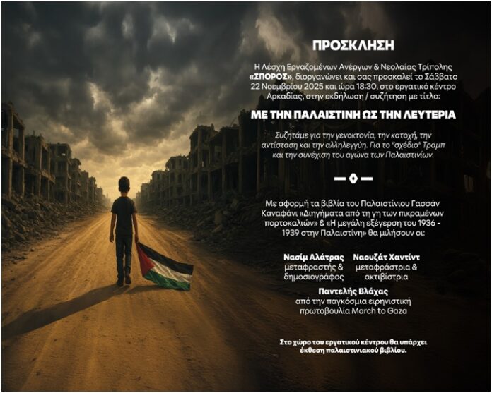 Η Λέσχη Εργαζομένων Ανέργων και Νεολαίας Τρίπολης ΄΄ΣΠΟΡΟΣ’’ διοργανώνει και σας προσκαλεί το Σάββατο 22 Νοεμβρίου 2025 και ώρα 18.30 στο Εργατικό Κέντρο Αρκαδίας, στην εκδήλωση – συζήτηση: