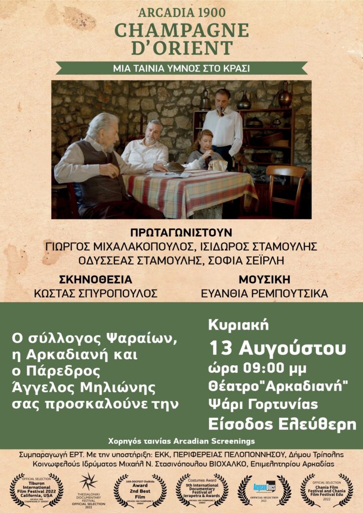 Η άγνωστη και τραγική ιστορία ενός παραγωγού σαμπάνιας, που ξεκινά στα τέλη του 19ου αιώνα, στην Τεγέα, είναι το θέμα της ταινίας, “Arcadia, Champagne d’ Orient”, του Κώστα Σπυρόπουλου