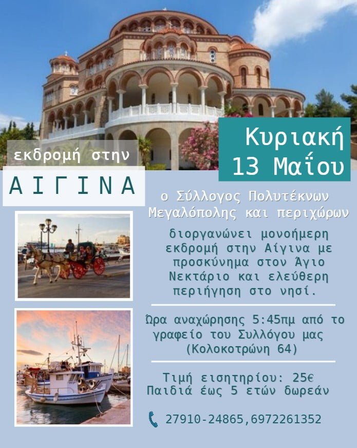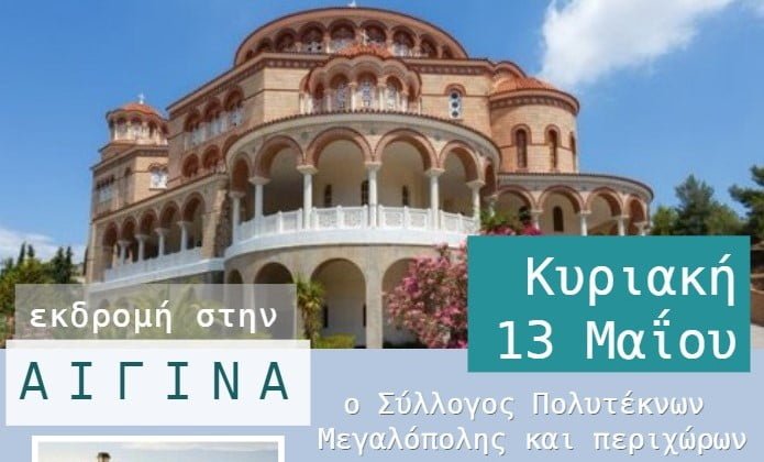 Ο Σύλλογος Πολυτέκνων Μεγαλόπολης και περιχώρων διοργανώνει μονοήμερη εκδρομή στην Αίγινα με προσκύνημα στον Άγιο Νεκτάριο και ελεύθερη περιήγηση στο νησί, την Κυριακή 13 Μαΐου 2018 !