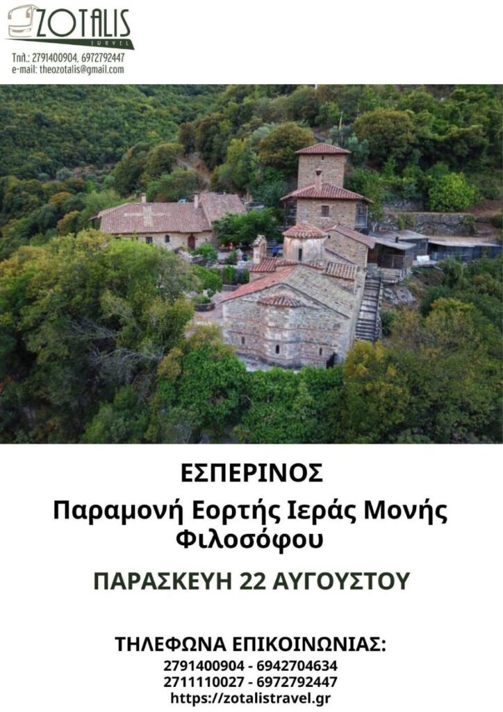 Το τουριστικό γραφείο Ζώταλη διοργανώνει τη Παρασκευή 22 Αυγούστου απογευματινή επίσκεψη στην Ιερά Μονή Φιλοσόφου για τη παρακολούθηση του Εσπερινού [παραμονή εορτής της Ιεράς Μονής].