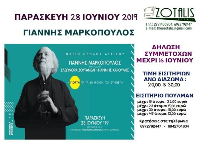 Η εκδρομή διοργανώνεται για τη συναυλία αφιερωμένη στον Γιάννη Μαρκόπουλο, στο Ηρώδειο. Τραγουδούν η Ελεονώρα Ζουγανέλη & ο Γιάννης Χαρούλης!