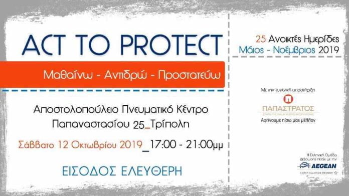 Ανοιχτή εκπαιδευτική ημερίδα για την προστασία από φυσικές καταστροφές πραγματοποιεί στην Τρίπολη, το Σάββατο 12 Οκτωβρίου 2019 η Ελληνική Ομάδα Διάσωσης, με την ευγενική υποστήριξη της εταιρείας Παπαστράτος, στο πλαίσιο του προγράμματος “Act to Protect” .