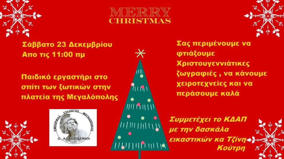 Ο Εμπορικός Σύλλογος Μεγαλόπολης διοργανώνει εκδήλωση με παιδικό εργαστήρι στο σπίτι των ξωτικών στην κεντρική πλατεία Μεγαλόπολης το Σάββατο 23 Δεκεμβρίου από τις 11.00