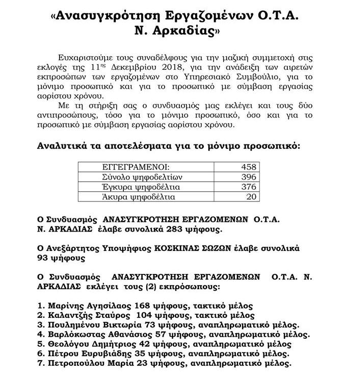 Ενημέρωση από την Ανασυγκρότηση Εργαζομένων ΟΤΑ Αρκαδίας