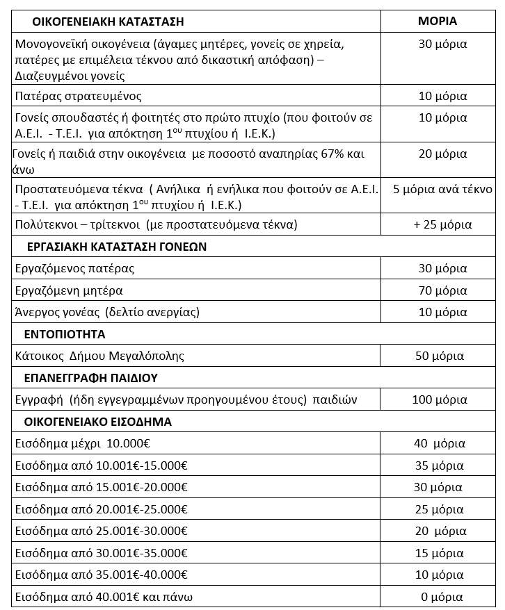 Τα κριτήρια μοριοδότησης αιτήσεων επανεγγραφών και νέων εγγραφών, στους Βρεφονηπιακούς Σταθμούς του Δήμου Μεγαλόπολης, εναρμονισμένα με τα οριζόμενα στον Πρότυπο Κανονισμό Λειτουργίας Δημοτικών Παιδικών και Βρεφονηπιακών Σταθμών ( ΚΥΑ 41087 (ΦΕΚ 4249/5-12-2017 τευχ. Β΄) , καθορίζονται με την α/α 141/2024 απόφαση Δημ.Συμβουλίου, ως εξής: