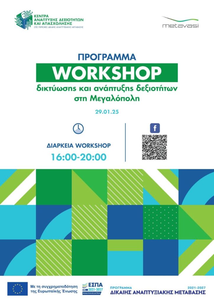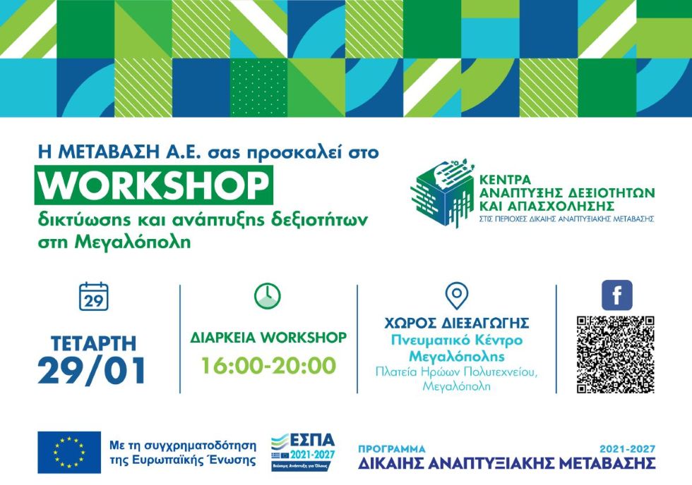 Η  ΜΕΤΑΒΑΣΗ Α.Ε. σας προσκαλεί στο Workshop Δικτύωσης και Ανάπτυξης Δεξιοτήτων, το οποίο θα πραγματοποιηθεί την Τετάρτη 29 Ιανουαρίου, από τις 16:00 έως τις 20:00, στο Πνευματικό Κέντρο Μεγαλόπολης (Πλατεία Ηρώων Πολυτεχνείου, Μεγαλόπολη).