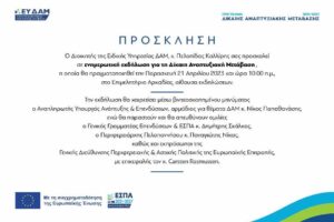 Την Παρασκευή 21 Απριλίου 2023, θα πραγματοποιηθεί η εκδήλωση ενημέρωσης της ΕΥΔΑΜ στο Επιμελητήριο Αρκαδίας. Στην εκδήλωση θα μιλήσουν ο Αναπληρωτής Υπουργός Ανάπτυξης και Επενδύσεων κ. Παπαθανάσης, ο Γενικός Γραμματέας Δημοσίων Επενδύσεων & ΕΣΠΑ κ. Δ. Σκάλκος, ο Περιφερειάρχης Πελοποννήσου κ. Π. Νίκας, ο Διοικητής της Ειδικής Υπηρεσίας ΔΑΜ κ. Π. Καλλίρης, καθώς και εκπρόσωποι των … Συνεχίστε να διαβάζετε το Ενημερωτική εκδήλωση στο Επιμελητήριο Αρκαδίας για τη Δίκαιη Αναπτυξιακή Μετάβαση την Παρασκευή 21 Απριλίου.