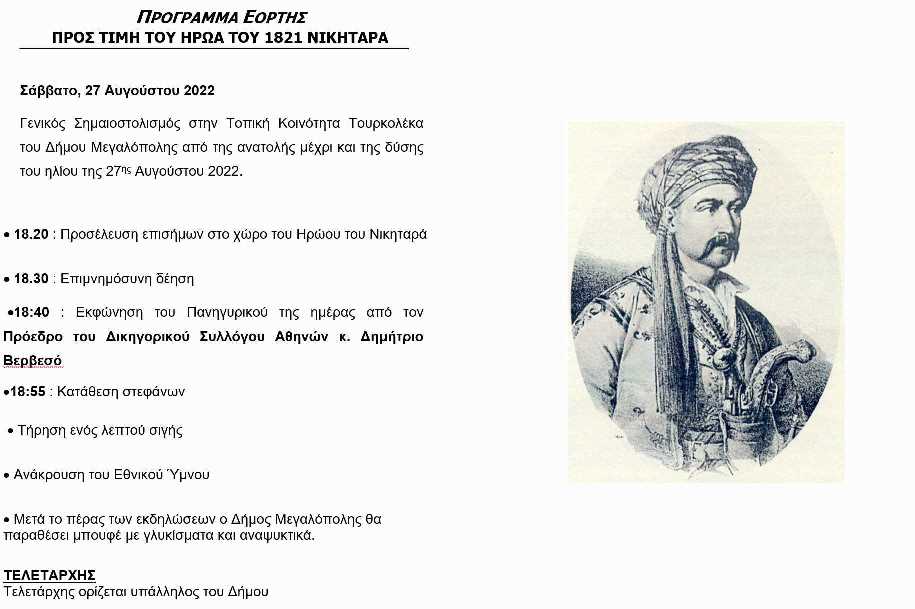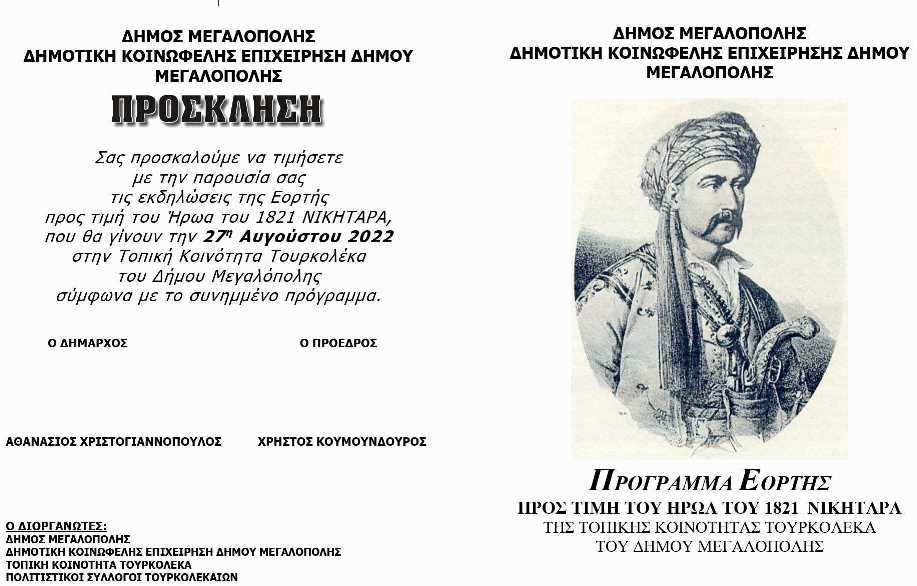 Σας προσκαλούμε να τιμήσετε με την παρουσία σας τις εκδηλώσεις της Εορτής προς τιμή του Ήρωα του 1821 ΝΙΚΗΤΑΡΑ, που θα γίνουν την 27η Αυγούστου 2022 στην Τοπική Κοινότητα Τουρκολέκα του Δήμου Μεγαλόπολης σύμφωνα με το συνημμένο πρόγραμμα.