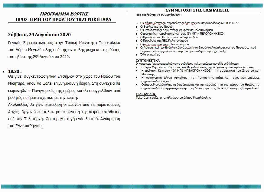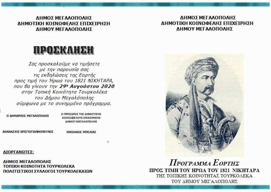 Σας προσκαλούμε να τιμήσετε με την παρουσία σας τις εκδηλώσεις της Εορτής προς τιμή του Ήρωα του 1821 ΝΙΚΗΤΑΡΑ, που θα γίνουν την 29η Αυγούστου 2020 στην Τοπική Κοινότητα Τουρκολέκα του Δήμου Μεγαλόπολης σύμφωνα με το συνημμένο πρόγραμμα.
