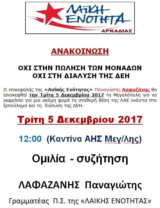 Ο επικεφαλής της «Λαϊκής Ενότητας» Παναγιώτης Λαφαζάνης θα επισκεφθεί την Τρίτη 5 Δεκεμβρίου 2017 τη Μεγαλόπολη για να εκφράσει για μια ακόμη φορά τη σταθερή θέση της ΛΑΕ ενάντια στο ξεπούλημα και τη διάλυση της ΔΕΗ.