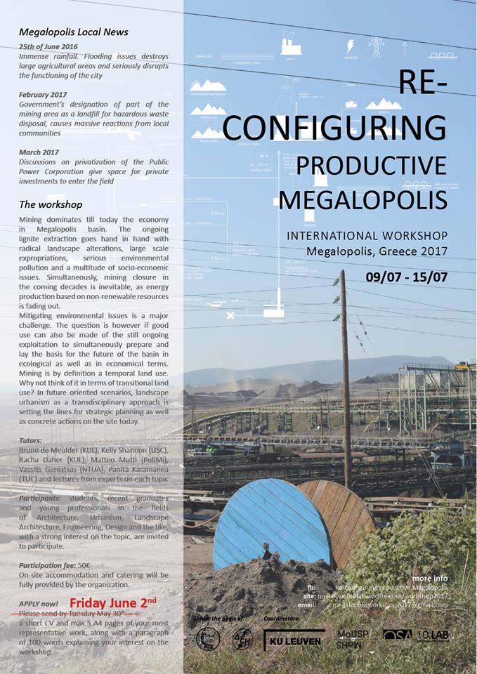 Aπό 9/7 έως 15/7/2017 πραγματοποιείται στη Μεγαλόπολη, με πρωτοβουλία των αρχιτεκτόνων Έλενας Κασσελούρη και Γαβριέλας Γεωργακάκη(STUDIO 0 LAB), ένα Επιστημονικό Συνέδριο-Διεθνές Εργαστήριο Σχεδιασμού, με θέμα «Μεταλλαγές του παραγωγικού τοπίου της Μεγαλόπολης», με σκοπό τη διερεύνηση σχεδιαστικών λύσεων για την πορεία του λεκανοπεδίου Μεγαλόπολης προς τη μεταλιγνιτική εποχή.