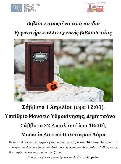 Το Σάββατο 1 Απριλίου 2017, στις 12:00, το μεσημέρι, το ΤΡΕΝΟ ΤΗΣ ΧΑΡΑΣ θα φτάσει στο Υπαίθριο Μουσείο Υδροκίνησης Δημητσάνας, φορτωμένο με πολλές απορίες έτοιμες να λυθούν κι άλλα τόσα υλικά για το εργαστήρι καλλιτεχνικής βιβλιοδεσίας για παιδιά!!!!