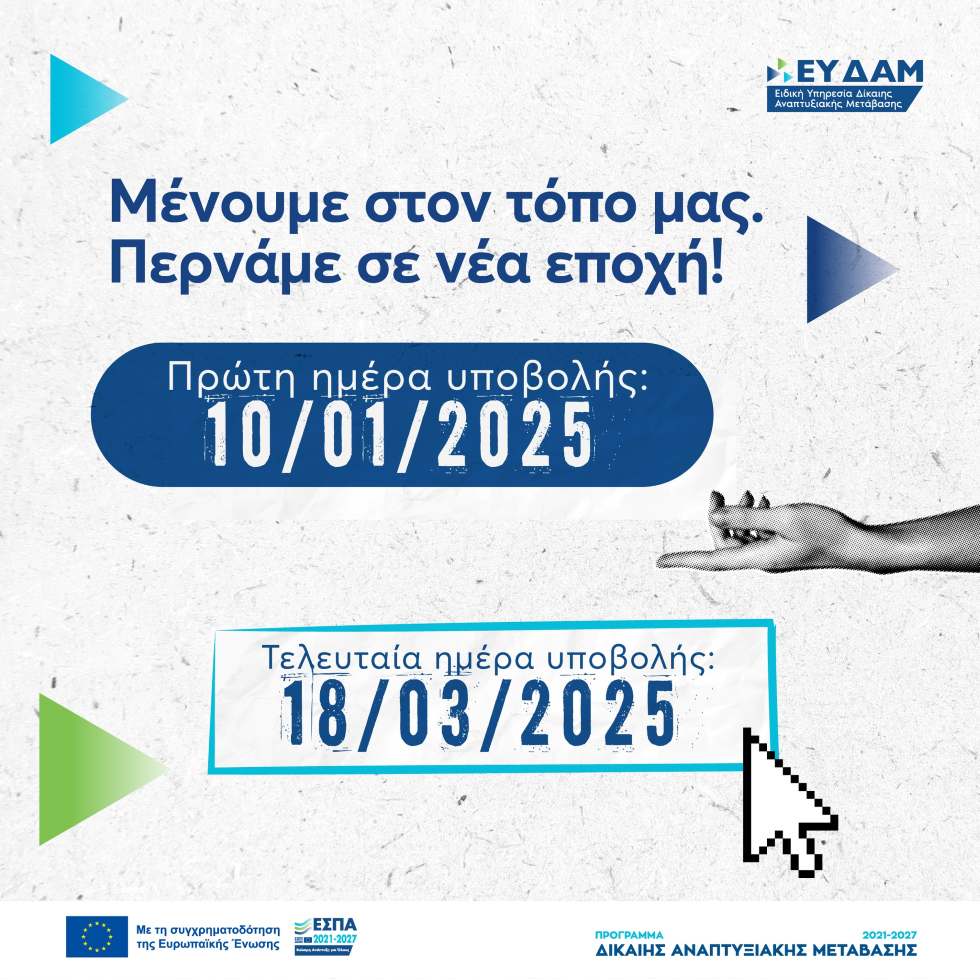 Οι δημοσιεύσεις έχουν αναρτηθεί στους διαδικτυακούς ιστοτόπους της ΕΥΔΑΜ www.eydam.gr, του ΕΣΠΑ 2021-2027 www.espa.gr, του ΕΦΕΠΑΕ www.efepae.gr και του εταίρου του, Διαχειριστική Ευρωπαϊκών Προγραμμάτων www.diaxeiristiki.gr.