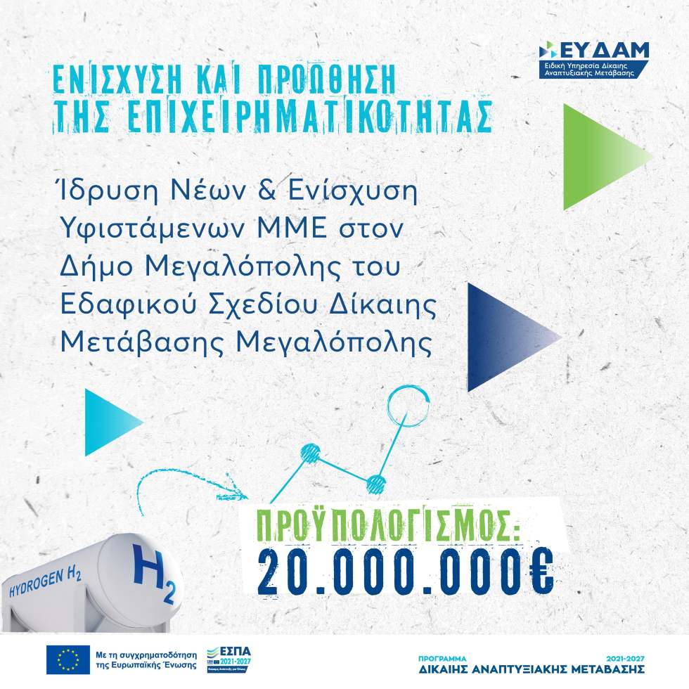 • Ίδρυση Επιχειρήσεων & Ενίσχυση Νέων Πολύ Μικρών και Μικρών Επιχειρήσεων στο Δήμο Μεγαλόπολης του Εδαφικού Σχεδίου Δίκαιης Μετάβασης Μεγαλόπολης, σύμφωνα με τον Καν. (ΕΕ) 2021/1056 για τη θέσπιση του Ταμείου Δίκαιης Μετάβασης ΕΣΠΑ 2021-2027