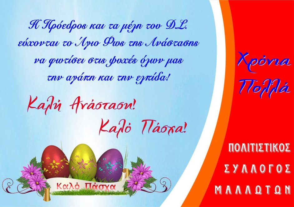 Ο Πρόεδρος και τα Μέλη του Διοικητικού Συμβουλίου του Εξωραϊστικού Συλλόγου των Απανταχού Παλαμαραίων ” Η Κοίμησις της Θεοτόκου ” εύχονται σε όλους τους συμπατριώτες και φίλους του χωριού μας καλή Ανάσταση και Χαρούμενο Πάσχα προ πάντων με υγεία, οικογενειακή και προσωπική ευτυχία !