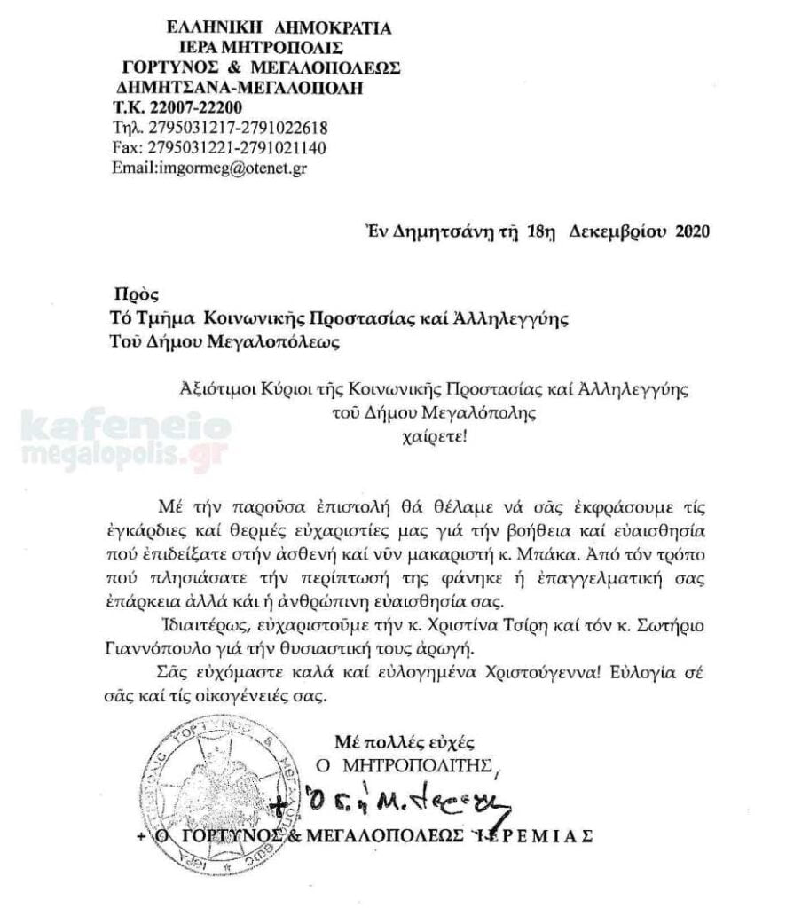 Ευχαριστήριες επιστολές στέλνει η Μητρόπολη Γόρτυνος και Μεγαλοπόλεως , προς τον Σύλλογο Γυναικών Μεγαλόπολης “Καλλιστώ” για συγκέντρωση τροφίμων για τα συσσίτια και προς το τμήμα Κοινωνικής Προστασίας και Αλληλεγγύης του Δήμου Μεγαλόπολης για την βοήθεια του.