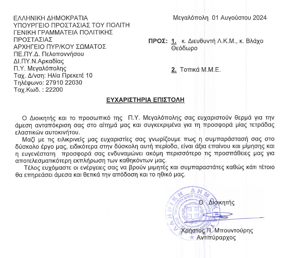 Ο Διοικητής της Πυροσβεστικής Υπηρεσίας Μεγαλόπολης , Αντιπύραρχος κ. Χ. Μπουντούρης , στέλνει ευχαριστήρια επιστολή στον Διευθυντή του Λιγνιτικού Κέντρου Μεγαλόπολης της ΔΕΗ κ. Βλάχο Θεόδωρο, για την προσφορά μια τετράδας ελαστικών αυτοκινήτου.