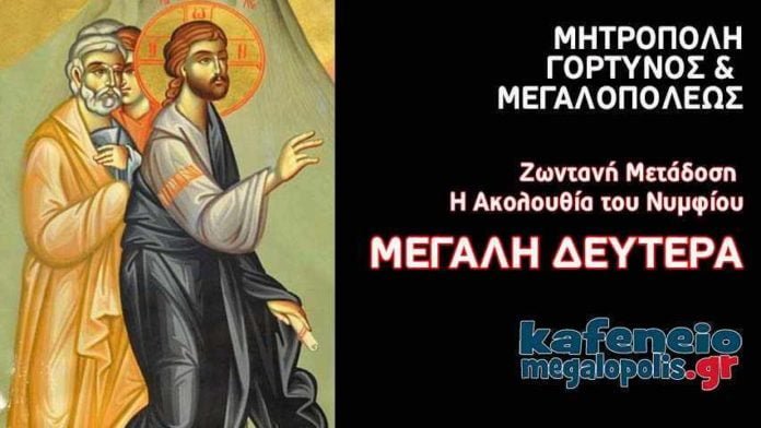 Η Μητρόπολη Γόρτυνος και Μεγαλοπόλεως και το Καφενείο Μεγαλόπολης θα μεταδώσουν την Ακολουθία του Νυμφίου της Μεγάλης Δευτέρας, από τον Ιερό Ναό Αγίου Νικολάου Μεγαλόπολης, μέσω διαδικτύου αφού υπάρχει απαγόρευση για την λειτουργία των Ναών με παρουσία κόσμου.