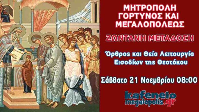 Μπορείτε να παρακολουθήσετε την Ζωντανή Μετάδοση Όρθρου και Θείας Λειτουργίας της εορτής των Εισοδίων της Θεοτόκου, το Σάββατο 21 Νοεμβρίου , η μετάδοση θα ξεκινήσει στις 08.00, στο παράθυρο που ακολουθεί: