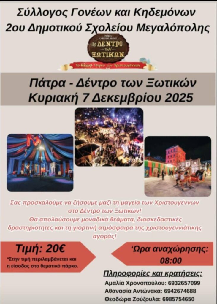 Ο Σύλλογος Γονέων Κηδεμόνων του 2ου Δημοτικού Σχολείου Μεγαλόπολης διοργανώνει εκδρομή στις 7 Δεκεμβρίου , Πάτρα – Δένδρο Ξωτικών.