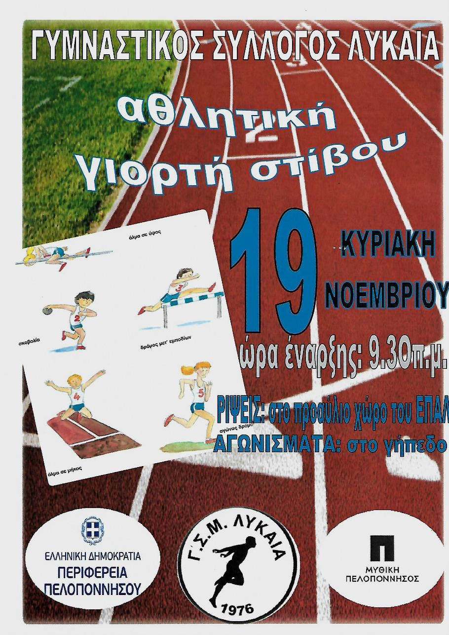 Ο Γ.Σ.Μ. ΛΥΚΑΙΑ και η Περιφέρεια Πελοποννήσου προκηρύσσουν ημερίδα αγώνων στίβου την Κυριακή 19/11/2017 και ώρα 09:30 στο ΔΑΚ ΜΕΓΑΛΟΠΟΛΗΣ και στον χώρο ρίψεων του ΕΠ.Α.Λ ΜΕΓΑΛΟΠΟΛΗΣ.