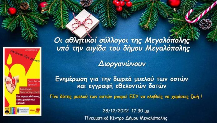 Μια προσπάθεια των αθλητικών συλλόγων της Μεγαλόπολης, που πρέπει να αγκαλιαστεί από όλους, γιατί ο καθένας μας ίσως να είναι ο μοναδικός που μπορεί να σώσει έναν συνάνθρωπο του που πάσχει από λευχαιμία η άλλο σοβαρό αιματολογικό νόσημα.