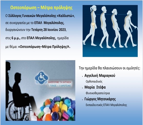 Ο σύλλογος Γυναικών Μεγαλόπολης ΚΑΛΛΙΣΤΩ σε συνεργασία με το ΕΠΑΛ ΜΕΓΑΛΟΠΟΛΗΣ διοργανώνει ημερίδα με θέμα «Οστεοπόρωση – Μέτρα πρόληψης» η οποία θα πραγματοποιηθεί στο χώρο του σχολείου, την Τετάρτη 28 Ιουνίου στις 18:00.
