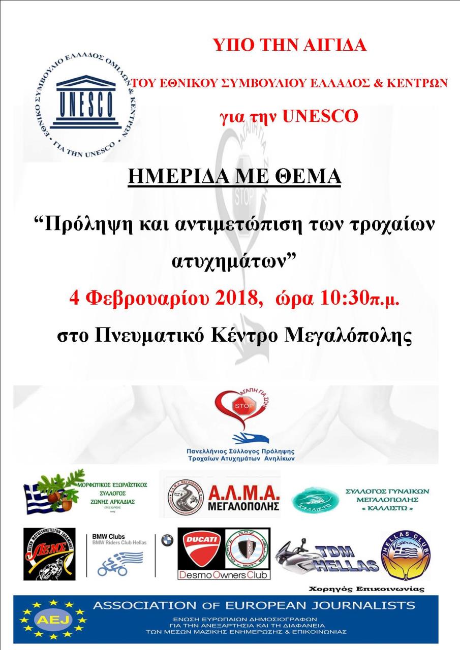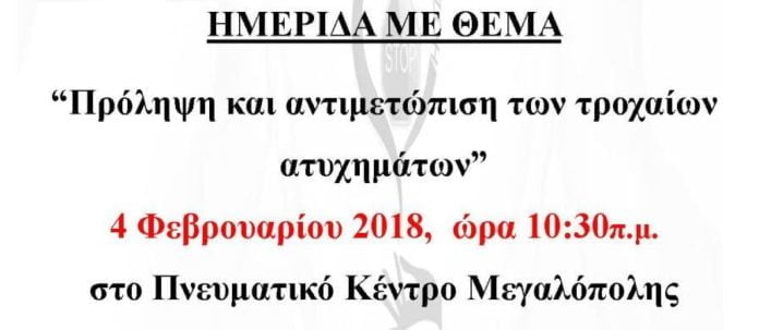 O Μορφωτικός Σύλλογος Ζώνης, ο Σύλλογος Γυναικών Μεγαλόπολης «Καλλιστώ», η ΑΛΜΑ Μεγαλόπολης και ο Πανελλήνιος Σύλλογος Πρόληψης Τροχαίων Ατυχημάτων Ανηλίκων, διοργανώνουν ημερίδα στις 4 Φεβρουαρίου 2018 και ώρα 10:30 στο Πνευματικό Κέντρο Μεγαλόπολης, με Θέμα: «Πρόληψη και αντιμετώπιση των τροχαίων ατυχημάτων».