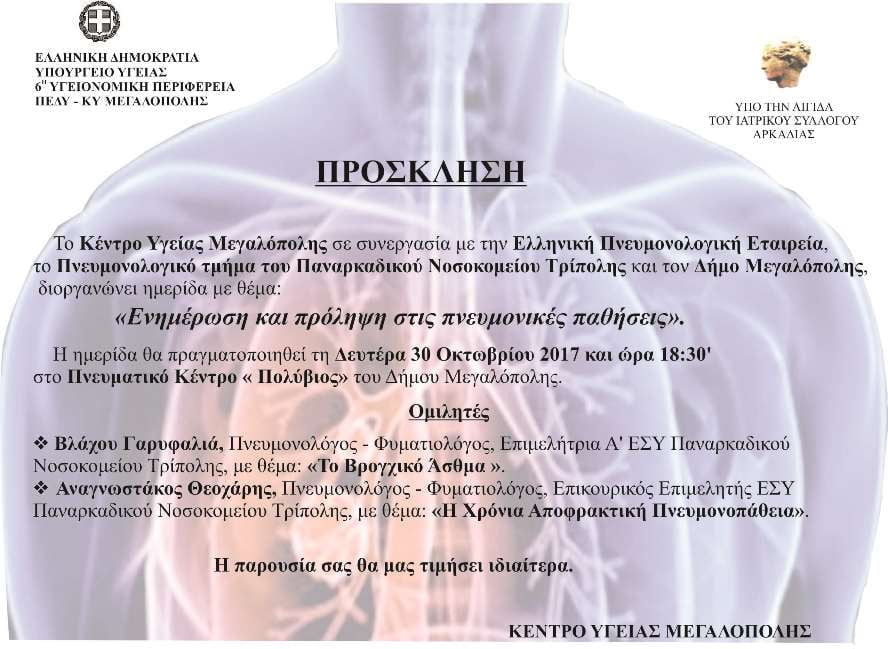 Την Δευτέρα 30 Οκτωβρίου και ώρα 6.30’ μ.μ. στο Πνευματικό Κέντρο του δήμου Μεγαλόπολης “Ο Πολύβιος” , θα πραγματοποιηθούν ομιλίες από τους πνευμονολόγους του Παναρκαδικού Νοσοκομείου Τρίπολης :