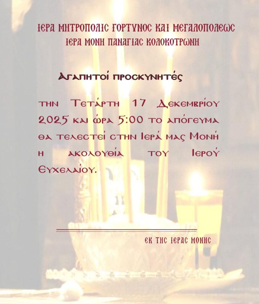 Την Τετάρτη 17 Δεκεμβρίου και ώρα 17:00, θα τελεστεί η Ακολουθία του Ιερού Ευχελαίου στην Μονή Παναγίας Κολοκοτρώνη Εκκλησούλας