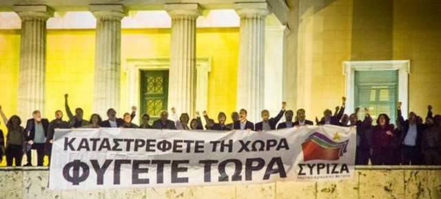 - Κλείνω με τη φωτογραφία των Βουλευτών του ΣΥΡΙΖΑ, από την πλατεία των «αγανακτισμένων», και σας επιστρέφω το σύνθημά σας: «Καταστρέφετε τη χώρα, φύγετε τώρα!».