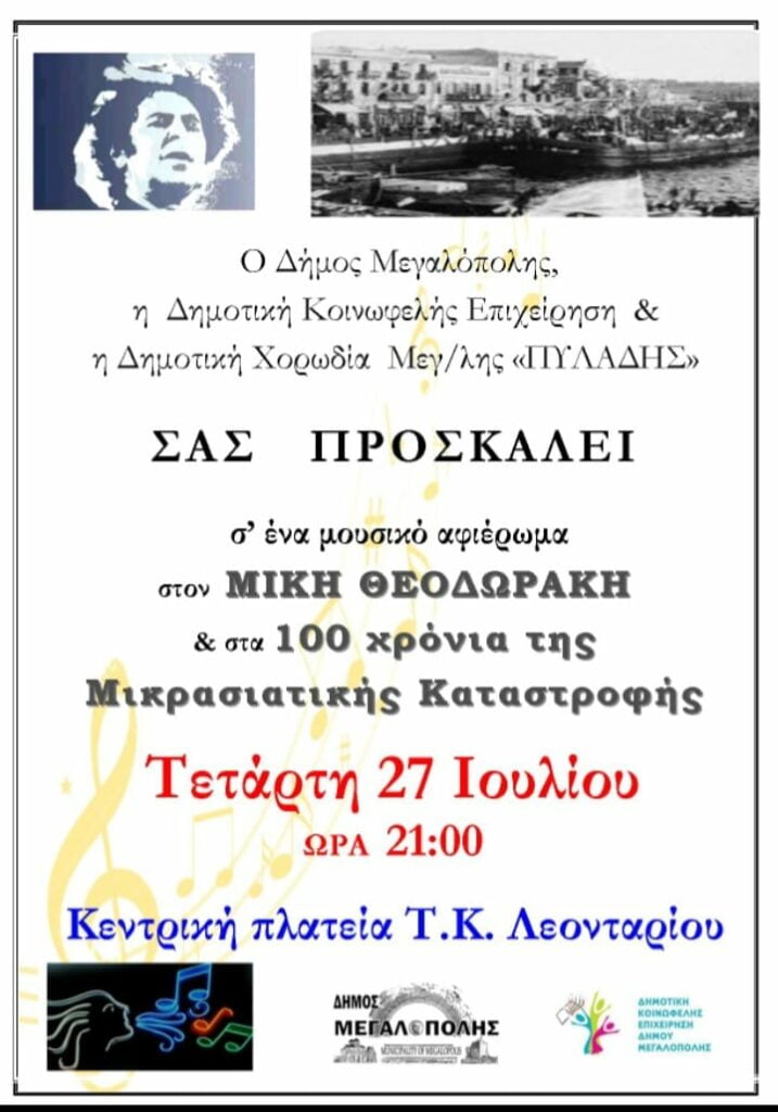 Η Δημοτική μας Χορωδία στα πλαίσια του φετινού Πολιτιστικού Καλοκαιριού τιμά τον σπουδαίο μουσικοσυνθέτη Μίκη Θεοδωράκη που είναι και θα παραμείνει για ΠΑΝΤΑ στις καρδιές μας και τα 100 Χρόνια από την Μικρασιατική Καταστροφή, ένα ιστορικό γεγονός που ΠΟΤΕ δεν πρέπει να λησμονούμε στο Λεοντάρι με μια εκδήλωση-αφιέρωμα την Τετάρτη 27 Ιουλίου.