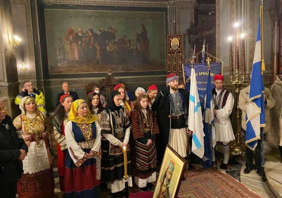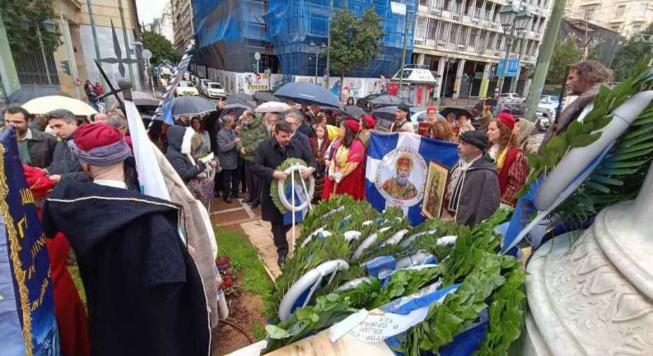Στη συνέχεια όλοι εν πομπή με τη συνοδεία παραδοσιακών οργάνων κατευθύνθηκαν στον παρακείμενο ανδριάντα του Γέρου του Μοριά, προ της Παλαιάς Βουλής, όπου εψάλη επιμνημόσυνη δέηση. Ακολούθησε κατάθεση στεφάνων από τις Περιφέρειες Αττικής και Πελοποννήσου, τους Δήμους Αθηναίων και Γορτυνίας, καθώς και δεκάδες φορείς και Συλλόγους.
