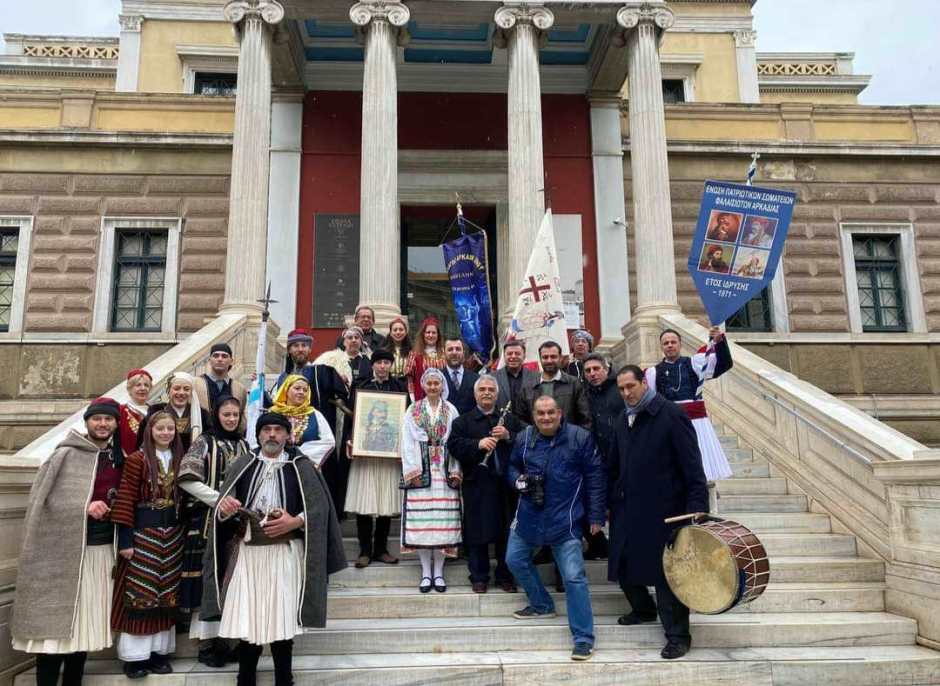 Η εκδήλωση έκλεισε με χορούς μπροστά από την Παλαιά Βουλή και κέρασμα από την Παγγορτυνιακή σε όλους με γλυκά από τη Δημητσάνα και τσίπουρο.