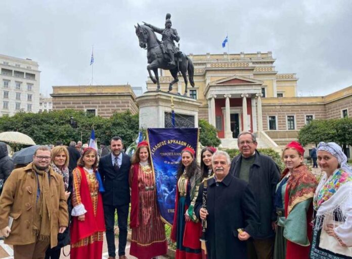 Η εκδήλωση έκλεισε με χορούς μπροστά από την Παλαιά Βουλή και κέρασμα από την Παγγορτυνιακή σε όλους με γλυκά από τη Δημητσάνα και τσίπουρο.