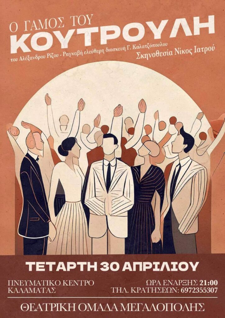 Η θεατρική Ομάδα Μεγαλόπολης παρουσιάζει το θεατρικό έργο «Ο γάμος του Κουτρούλη» σε ελεύθερη διασκευή του Γιάννη Καλατζόπουλου και σκηνοθεσία του Νίκου Ιατρού.