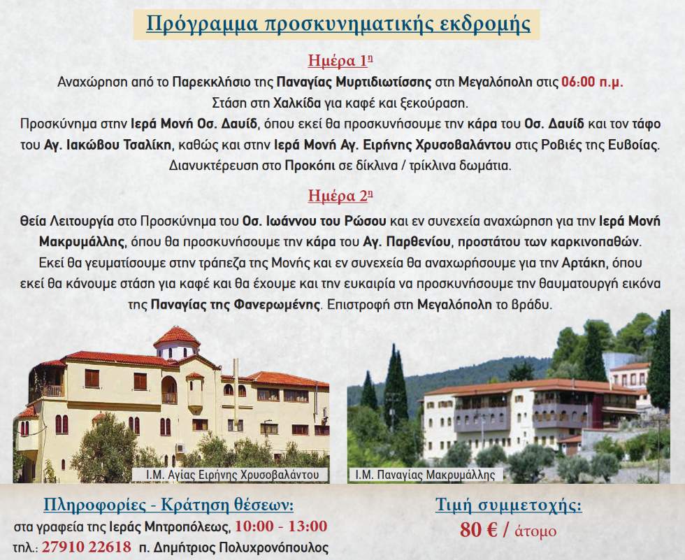 Η Ιερά Μητρόπολη Γόρτυνος & Μεγαλοπόλεως διοργανώνει διήμερη προσκυνηματική εκδρομή 10-11 Ιουλίου στην Εύβοια.