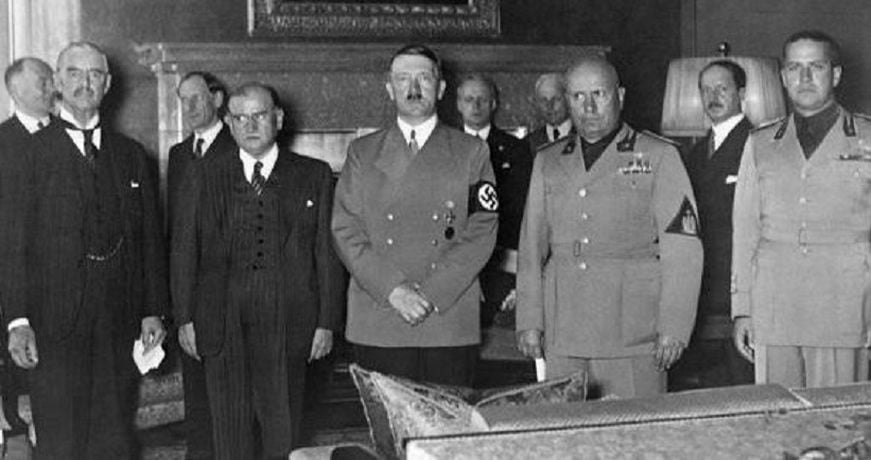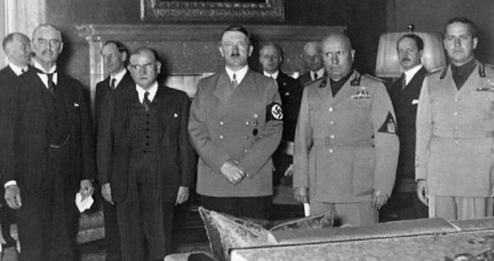 Στο Μόναχο στις 29 Σεπτεμβρίου του 1938  έγινε μία τετραμερής διάσκεψη. Σ’ αυτή συμμετείχαν οι μεγάλες δυνάμεις της Ευρώπης. Η Βρετανία με τον πρωθυπουργό Τσάμπερλεν. Η Γαλλία  με τον πρωθυπουργό Νταλαντιέ. Η Ιταλία με τον δικτάτορα Μουσολίνι. Και η  Γερμανία με τον καγκελάριο Αδόλφο Χίτλερ.