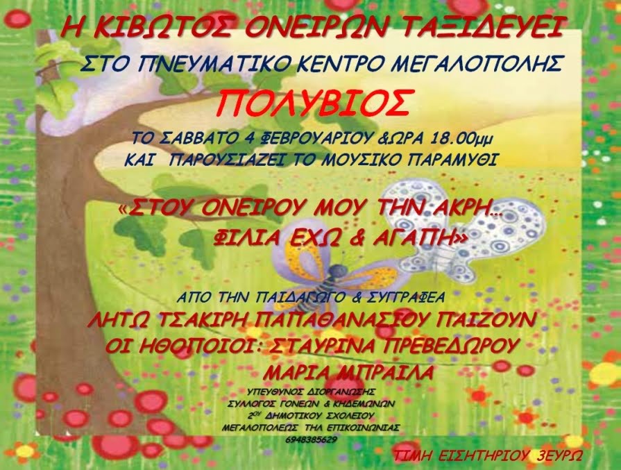 Ο Σύλλογος Γονέων και Κηδεμόνων του 2ου Δημοτικού Σχολείου προσκαλεί όλα τα παιδιά της πόλης μας να ταξιδέψουμε μαζί με το μουσικό παραμύθι ΤΟΥ ΟΝΕΙΡΟΥ ΜΟΥ ΤΗΝ ΑΚΡΗ ΦΙΛΙΑ ΕΧΩ ΚΑΙ ΑΓΑΠΗ , της παιδαγωγού και συγγραφέα ΛΗΤΩ ΤΣΑΚΙΡΗ ΠΑΠΑΘΑΝΑΣΙΟΥ.