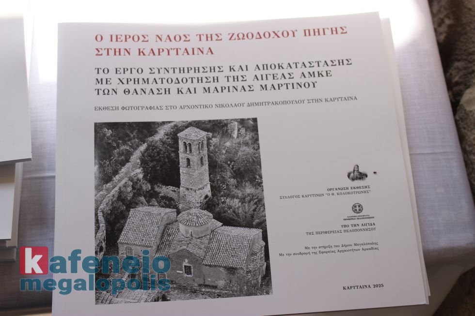 Η εκδήλωση έγινε στην Καρύταινα , στην αίθουσα του Αρχοντικού του Νικόλαου Δημητρακόπουλου, στην οποία υπήρχε και έκθεση με τις εργασίες που γίνονται για την αναστήλωση και αποκατάσταση του Ιερού Ναού της Ζωοδόχου Πηγής.