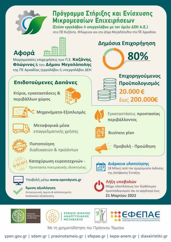 Διαδικτυακή Συνέντευξη Τύπου παραχώρησαν την Τετάρτη 10 Νοεμβρίου 2021 και ώρα 12:00 ο Πρόεδρος της Συντονιστικής Επιτροπής του Σχεδίου Δίκαιης Μετάβασης (ΣΔΑΜ) κ. Κων/νος Μουσουρούλης, ο Πρόεδρος του Δ.Σ. του Πράσινου Ταμείου κ. Ευστάθιος Σταθόπουλος και ο Πρόεδρος του Δ.Σ. του ΕΦΕΠΑΕ κ. Πλάτων Μαρλαφέκας για το Πρόγραμμα Στήριξης και Ενίσχυσης Μικρομεσαίων Επιχειρήσεων για την ανάπτυξη βιώσιμων οικονομικών δραστηριοτήτων χαμηλού ανθρακικού αποτυπώματος στις Π.Ε. Κοζάνης, Φλώρινας και στο Δήμο Μεγαλόπολης της Π.Ε Αρκαδίας, που χρηματοδοτείται από το Πράσινο Ταμείο στο πλαίσιο του ΣΔΑΜ.
